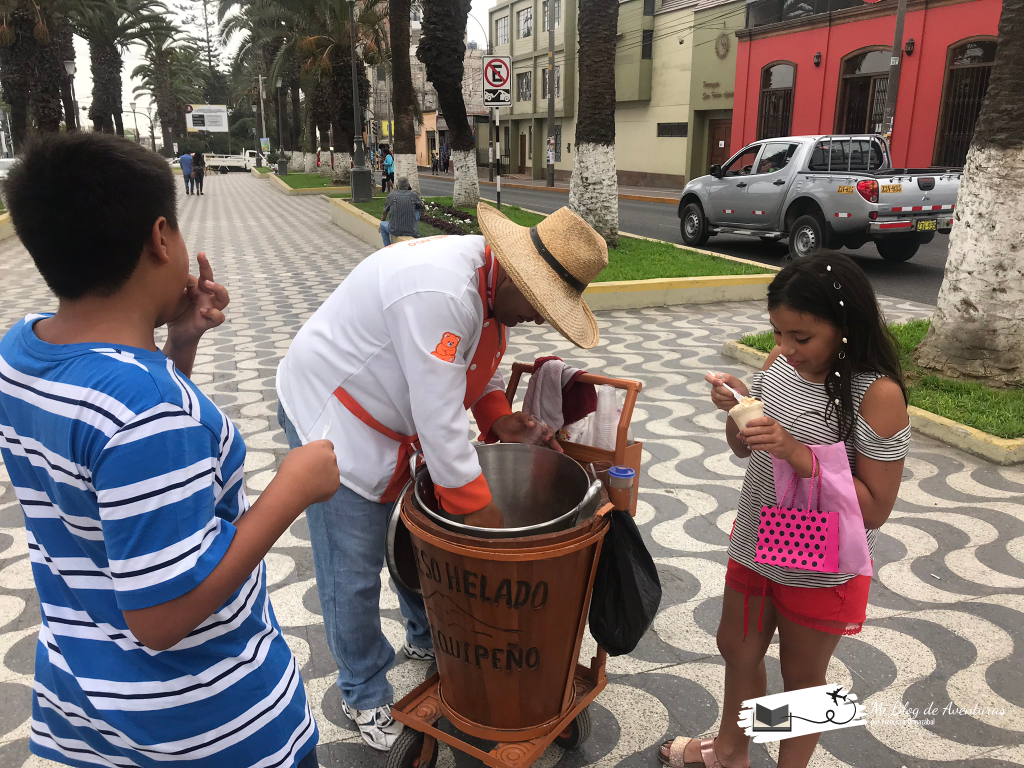 Mientras caminábamos aprovechamos de probar el «queso helado arequipeño», es como un helado de leche y canela que se hace batiendo la mezcla en un balde metálico sobre hielo. ¡Y estaba muy rico!
